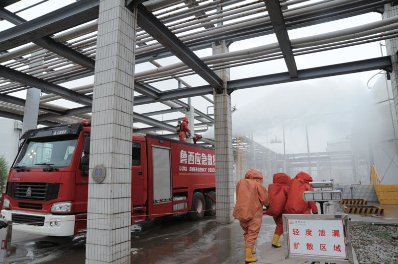 本次演練設定魯西集團園區內960#B區粗單體A罐下部進料管泄漏致使巡檢人員昏迷被困,擴散范圍1000米左右。事故發生后,現場巡檢監護人員立即報告單位負責人,逐級報告高新區管委會和市安監局,并迅速采取有效措施,組織搶救,防止事故擴大,減少人員傷亡和財產損失。高新區管委會和市安監局接到報告后,立即將發生事故的單位、時間、地點、簡要經過、人員傷亡情況以及初步分析的事故原因向市政府和省安監局報告。