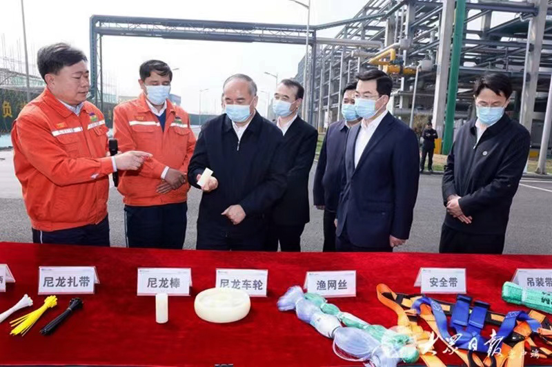 “年產(chǎn)60萬噸己內酰胺/尼龍6項目是2023年省重大項目,屬于省‘十強產(chǎn)業(yè)’中的新能源新材料產(chǎn)業(yè)項目。”在項目建設現(xiàn)場,公司高級副總經(jīng)理王富興向林武書記詳細匯報了項目建設規(guī)模、工程進度、項目工藝、產(chǎn)品性能及市場競爭優(yōu)勢等情況。林武書記現(xiàn)場詢問了項目建設安全管控、生產(chǎn)能耗、節(jié)能降碳措施以及產(chǎn)品應用領域等。林武書記指出,針對目前國家對原料煤的考核政策調整,魯西集團在嚴格執(zhí)行國家最新能耗、環(huán)保標準的基礎上,要推進原料用煤的高效利用項目,堅定不移推動綠色低碳高質量發(fā)展。同時要求地方政府全力配合企業(yè)的項目建設,做好服務保障,優(yōu)化發(fā)展環(huán)境,用心用力解決項目建設中的難題,努力將項目做成樣板工程。