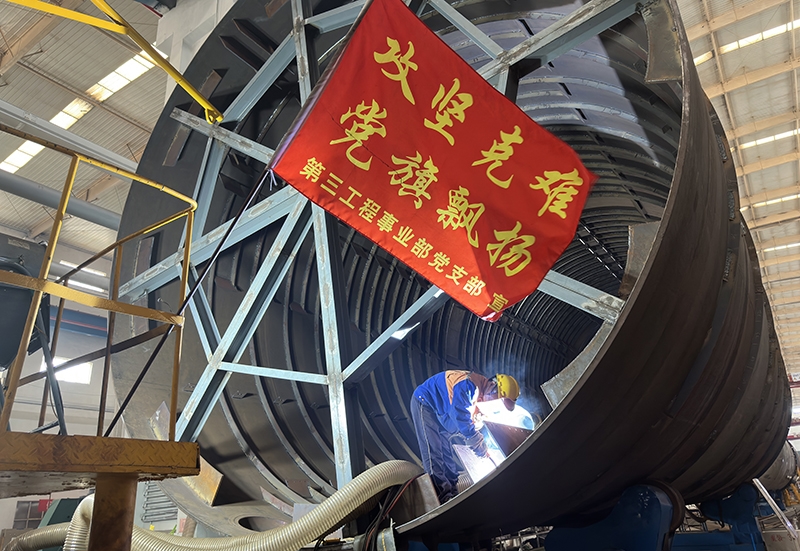 目前,魯西集團40萬噸/年有機硅項目的建設施工正在緊張有序進行中,二元塔作為項目的核心設備進入了制作的關鍵期,該設備共有三臺,單臺高度90m,直徑6.6m,重量達1000噸,且設備內部結構復雜,焊接工作量大。由于設備體積大,無法在廠房內完成整體制作,為保證設備制作質量,充分考慮后期運輸安裝等因素,技術部門反復研討論證,首次采用了“車間預制+現場組焊”的方式進行大型高塔設備制作?;鶎狱h支部抽調精干力量,成立黨員突擊隊,一部分在車間加班加點對二元塔預制,另一部分到項目現場進行設備底部裙座環縫合口焊接、外口焊接等工作。廣大黨員克服戰高溫斗酷暑,認真落實各項安全措施和質量管控要求,為設備制作保質保量按期完成奠定了基礎。