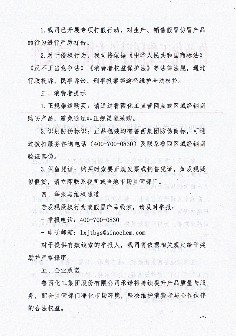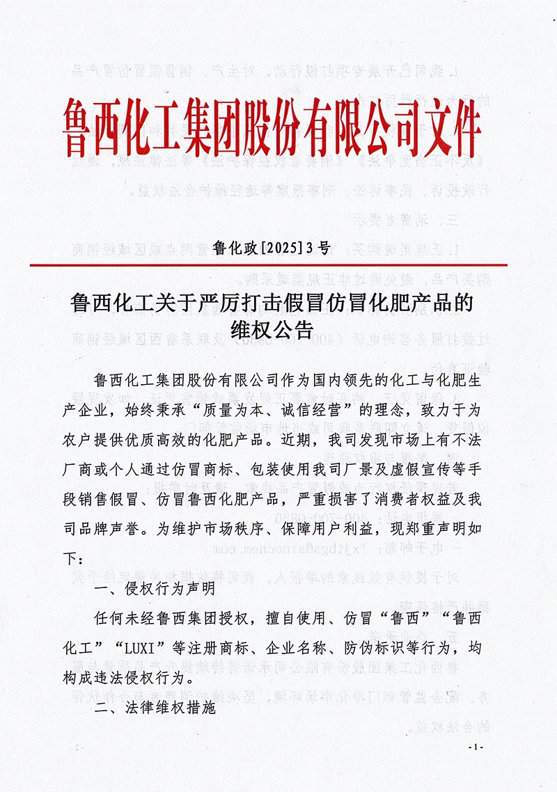 魯西化工關于嚴厲打擊假冒仿冒化肥產品的維權公告